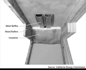 The California Building Code (CBC) requires a minimum vent area to be provided in roofs with attics, including enclosed rafter roofs creating cathedral or vaulted ceilings. Check with the local building jurisdiction to determine which of the two CBC ventilation requirements are to be followed: