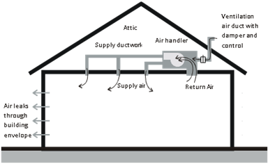 Supply ventilation works in just the opposite way as exhaust ventilation. Outside air enters the house through a dedicated supply fan or through the central HVAC system air handler and escapes through leaks in the building envelope.