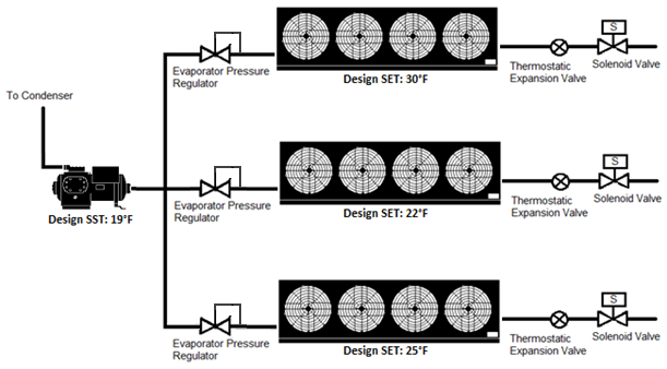 The minimum saturated condensing temperature setpoint must be 70°F (21°C) or less. For systems utilizing halocarbon refrigerants with glide, the SCT setpoint shall correlate with a midpoint temperature (between the refrigerant bubble-point and dew point temperatures) of 70°F (21°C) or less. As a practical matter, a maximum SCT setpoint is also commonly employed to set an upper bound on the control setpoint in the event of a sensor failure and to force full condenser operation during peak ambient conditions. This value should be set high enough that it does not interfere with normal operation.