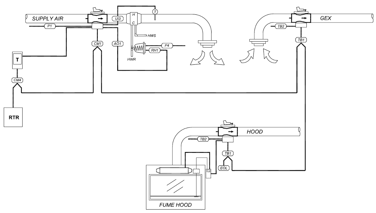 Figure 10-39 below show the zone components for a variable air volume (VAV) laboratory. There are three zone valves shown in this image: one each on the supply air to the zone; the fume hood (if one exists), and; the general exhaust valve (GEX) if one is needed. These zone valves can be venturi type valves as shown in this image or standard dampers like those used for VAV boxes in offices. The dampers or venturi valves must be designed to resist corrosion and damage from the exhaust. The hood valve when it is used is controlled to automatically maintain the design sash face velocity as the hood sash is opened or closed. The role of the supply valve is to maintain space pressurization by tracking the sum of the hood and general exhausts in the space. The supply valves are typically provided with a reheat coils to maintain space comfort for heating. The GEX is typically used to control the cooling, on call for cooling it opens, and the supply valve in turn opens to maintain space pressure. In some systems the supply modulates like a typical VAV box in response to the thermostat and the GEX modulates to maintain space pressure.