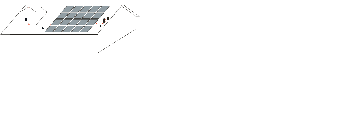 Any obstruction located on the roof or any other part of the building that projects above the solar zone must be located at a sufficient horizontal distance away from the solar zone such that the obstruction will not shade the solar zone. Equation 9-1 and Figure 9.2 describe the allowable distance between any obstruction and the solar zone. For each obstruction, the horizontal distance (“D”) from the obstruction to the solar zone has to be at least two times the height difference (“H”) between the highest point of the obstruction and the horizontal projection of the nearest point of the solar zone.